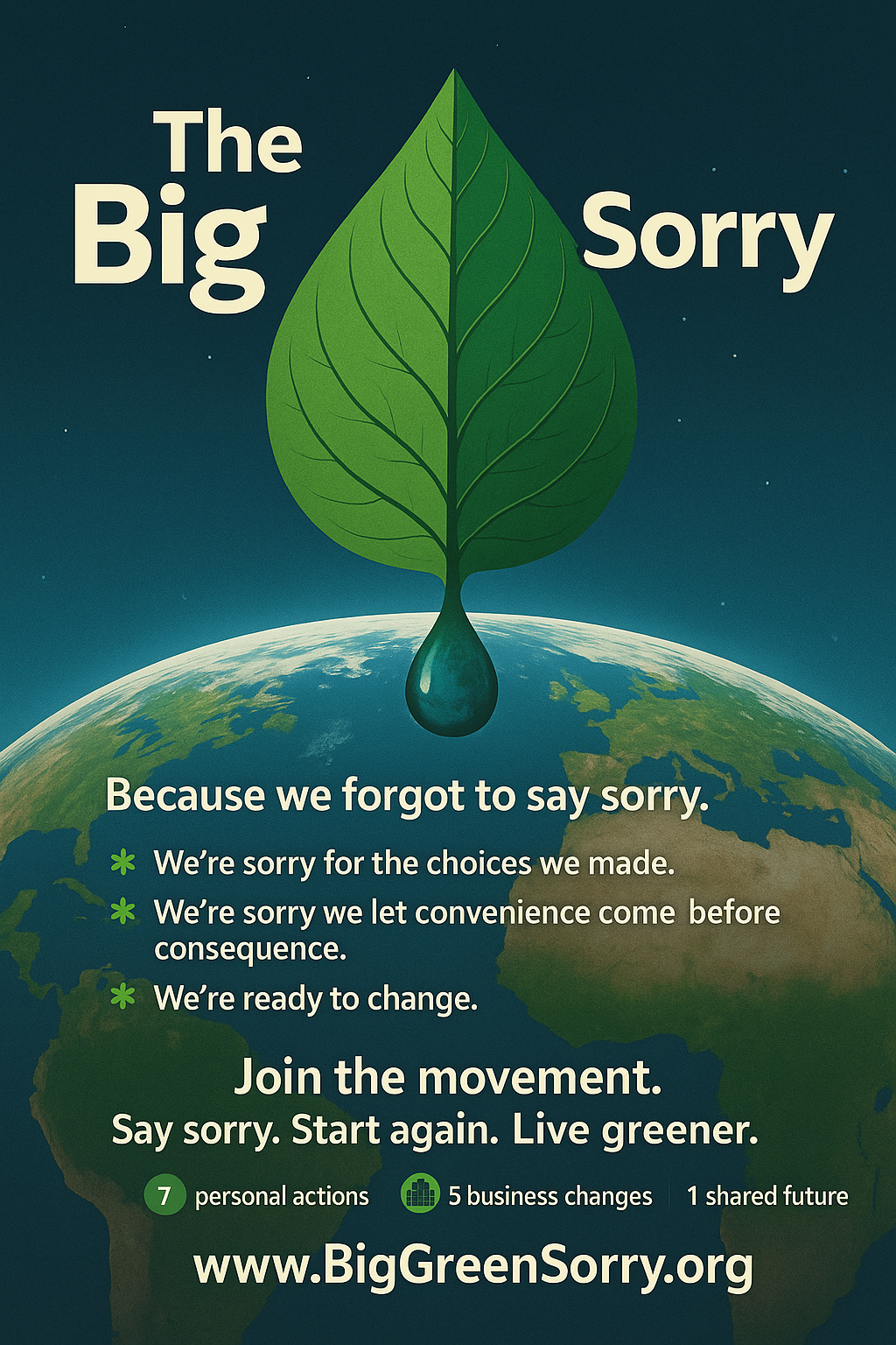 The Big Green Sorry is a grassroots movement of ordinary citizens taking collective responsibility for the environmental damage caused by unchecked consumerism and industrial excess. We acknowledge that we accepted the comforts of the status quo without questioning the cost to our planet, and we are no longer willing to remain silent.